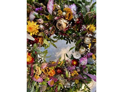 Podzimní věnec z přírodních sušených květin a zeleně, ručně vázaný do bohatého kruhu plného barev a struktur. Originální dekorace na dveře i stůl.