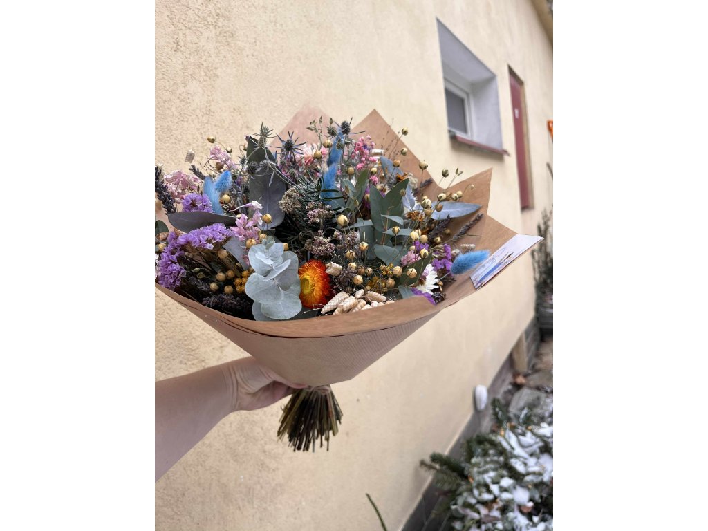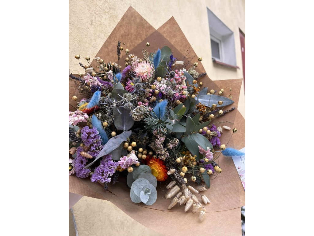 Každý kus je originál – květiny sušíme přirozenou cestou a kytice vážeme ručně na naší Květinové farmě Svazenka. Díky tomu má každá kytice svou vlastní kompozici a charakter.